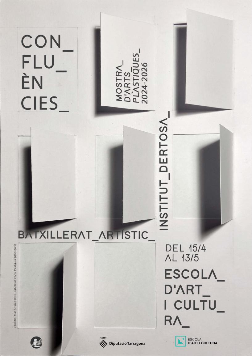 El grup d'alumnes de Batxillerat Artístic de l'Institut Dertosa (Tortosa) exposa les seves peces, realitzades al llarg dels dos anys d'etapa formativa. Confluències, una exposició que fa créixer el vincle educatiu i cultural entre l'Escola d'Art i Cultura i els estudiants de Batxillerat. La mostra es podrà visitar fins al 13 de maig.