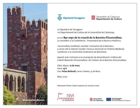 En el marc dels 850 anys de la creació de la Baronia d'Escornalbou tindrà lloc un esdeveniment que comptarà amb l'assistència de la presidenta de la Diputació, Noemí Llauradó, la delegada de la Generalitat a Tarragona, Teresa pallarès, la directora dels Serveis Territorials de Cultura, Lourdes Malgrat, i el director dels Serveis Territorials d'Acció Climàtica, Alimentació i Agenda Rural, Àngel Xifré, acompanyats dels alcaldes i alcaldesses de la Baronia d'Escornalbou.