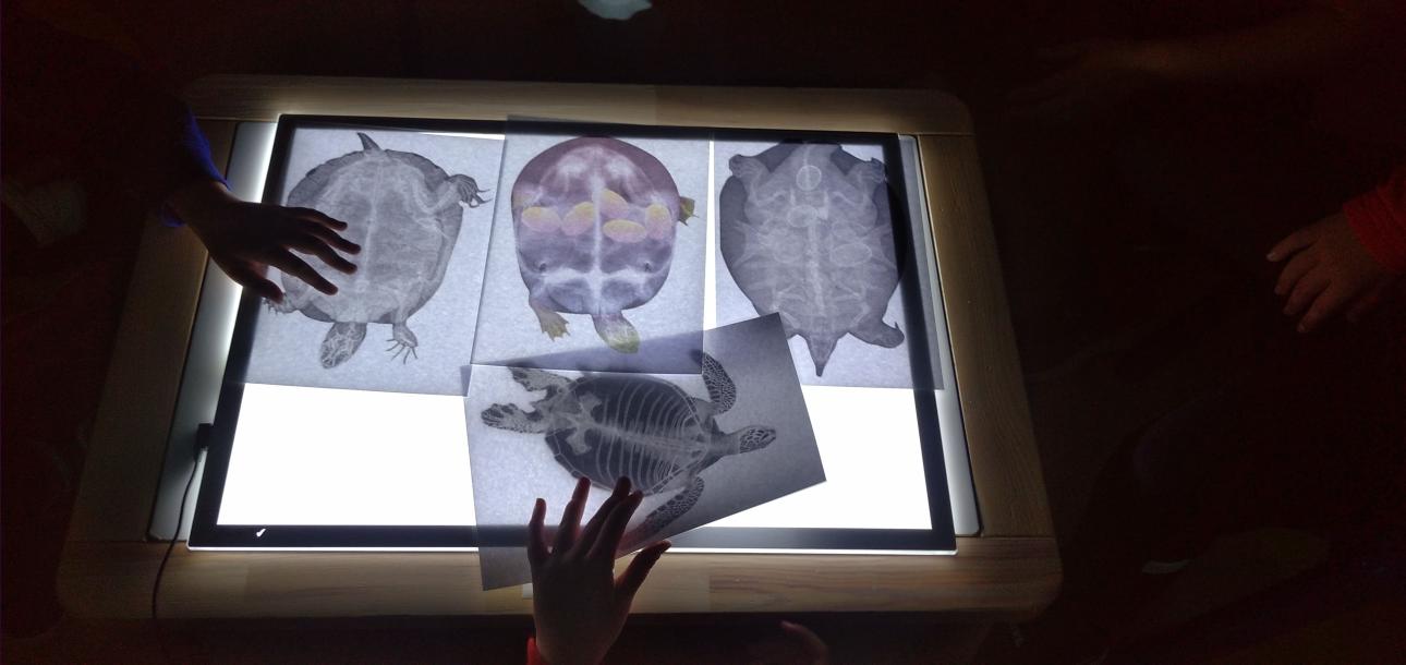 Tot va començar amb la lectura del conte La tortugueta i el mar, una història que ens va permetre conèixer les característiques de les tortugues d’una manera emocionant i plena d’aventures. A través de la taula de llums, vam poder treballar els detalls de la història i també observar l’interior d’una d’elles mitjançant diverses radiografies, una eina que ens ha ajudat a entendre millor l’estructura del seu cos.