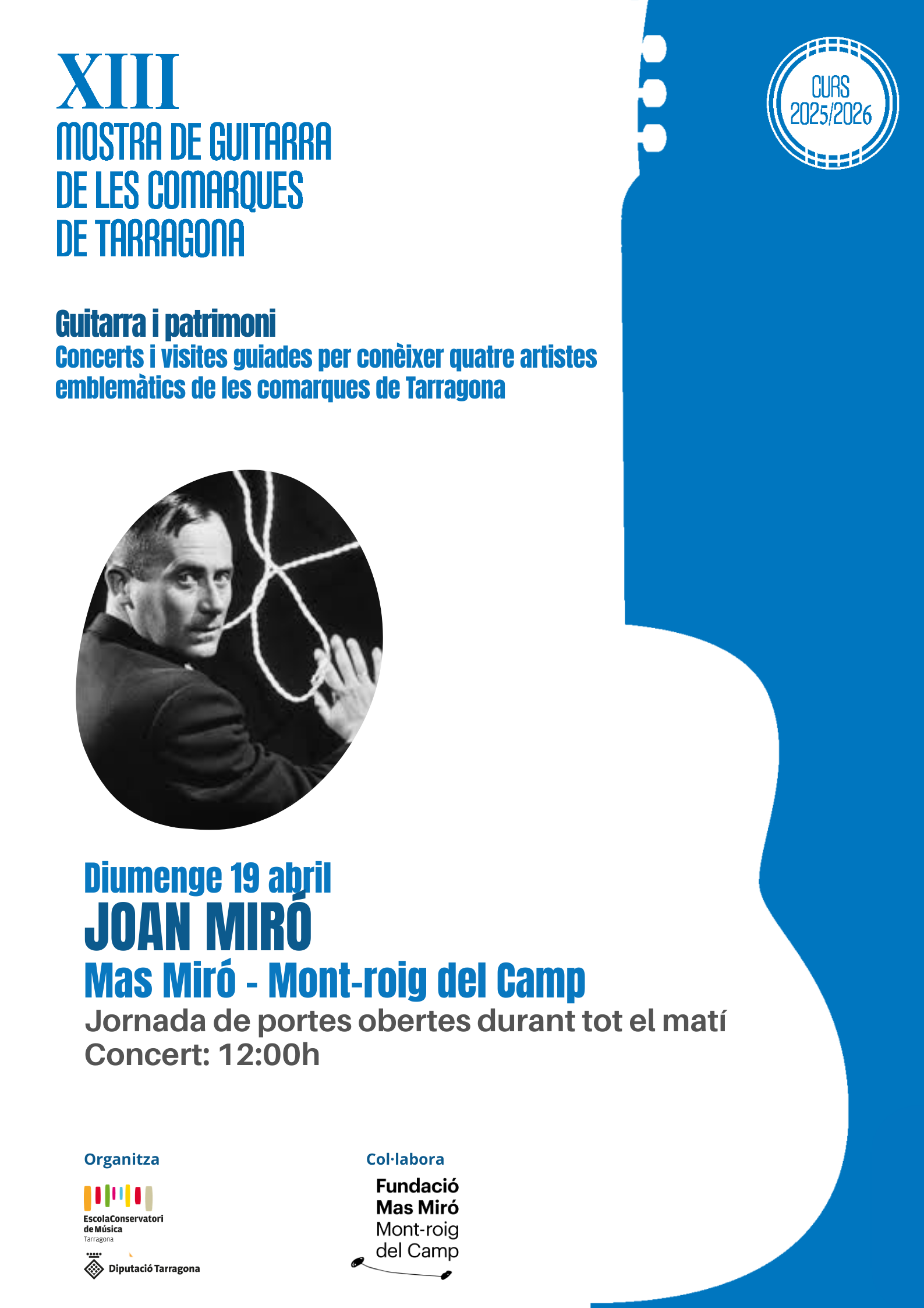 Concert Guitarra i patrimoni Concert i visita guiada per conèixer artistes emblemàtics - Joan Miró 19 abril 2026 Hora: 12:00 h - 13:00 h On: Mas Miró - Mont-roig del Camp Jornada de portes obertes durant tot el matíConcert: 12:00h Fitxers relacionats Cartell