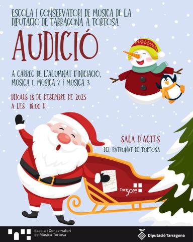 Inici AUDICIONS NADAL 2025 Entrevista a Joan Ventura. Exalumne de Trompeta DOCUMENTS ACADÈMICS 2025-2026 REVISTA ORIOL 50È ANIVERSARI Coneix el nostre centre Agenda AGENDA Concert de les Orquestres de Grau Professional On: Capella del Centre Sant Enric d'Ossó Quan: 16 desembre 2025 Hora: 19:45 h - 21:00 h AGENDA Concert de la Banda de Grau Professional On: Auditori de la Unió Filharmònica d'Amposta Quan: 16 desembre 2025 Hora: 20:15 h - 21:45 h AGENDA Audició del cor de Grau Professional On: Sala d'actes del Patronat Quan: 17 desembre 2025 Hora: 20:30 h - 21:30 h AGENDA Audició de l'alumant d'Iniciació, Música 1, 2 i 3 On: Sala d'actes del Patronat Quan: 18 desembre 2025 Hora: 18:00 h - 19:00 h Més agenda Notícies Notícies 15/12/2025 Xerrades orientatives sobtre els Estudis Superiors de Música Notícies 09/12/2025 Audicions de l'Aula de Guitarra Alumni 09/12/2025 Entrevista a Joan Ventura Notícies 18/11/2025 Sortida al Museu de la Música i al concert Suite Flamenca Més notícies Enllaços directes Centre Al bell mig de Tortosa L'escola de Música Des dels 5 anys Conservatori Formem professionals de la música Projectes La Banda Simfònica, les diades de Santa Cecília, L'estranya malaltia de la Cinta... Anualment celebrem, organitzem i compartim projectes musicals on l'alumnat n'és protagonista. Vés-hi