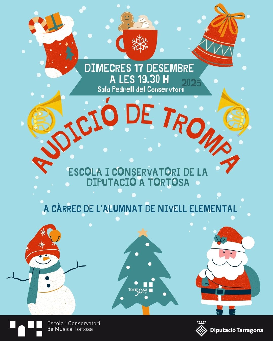 Fil d'ariadna Inici Agenda Audició de Trompa de Nivell Elemental Audició de Trompa de Nivell Elemental Quan: 17 desembre 2025 Hora: 19:30 h - 20:30 h On: Sala Pedrell del Conservatori