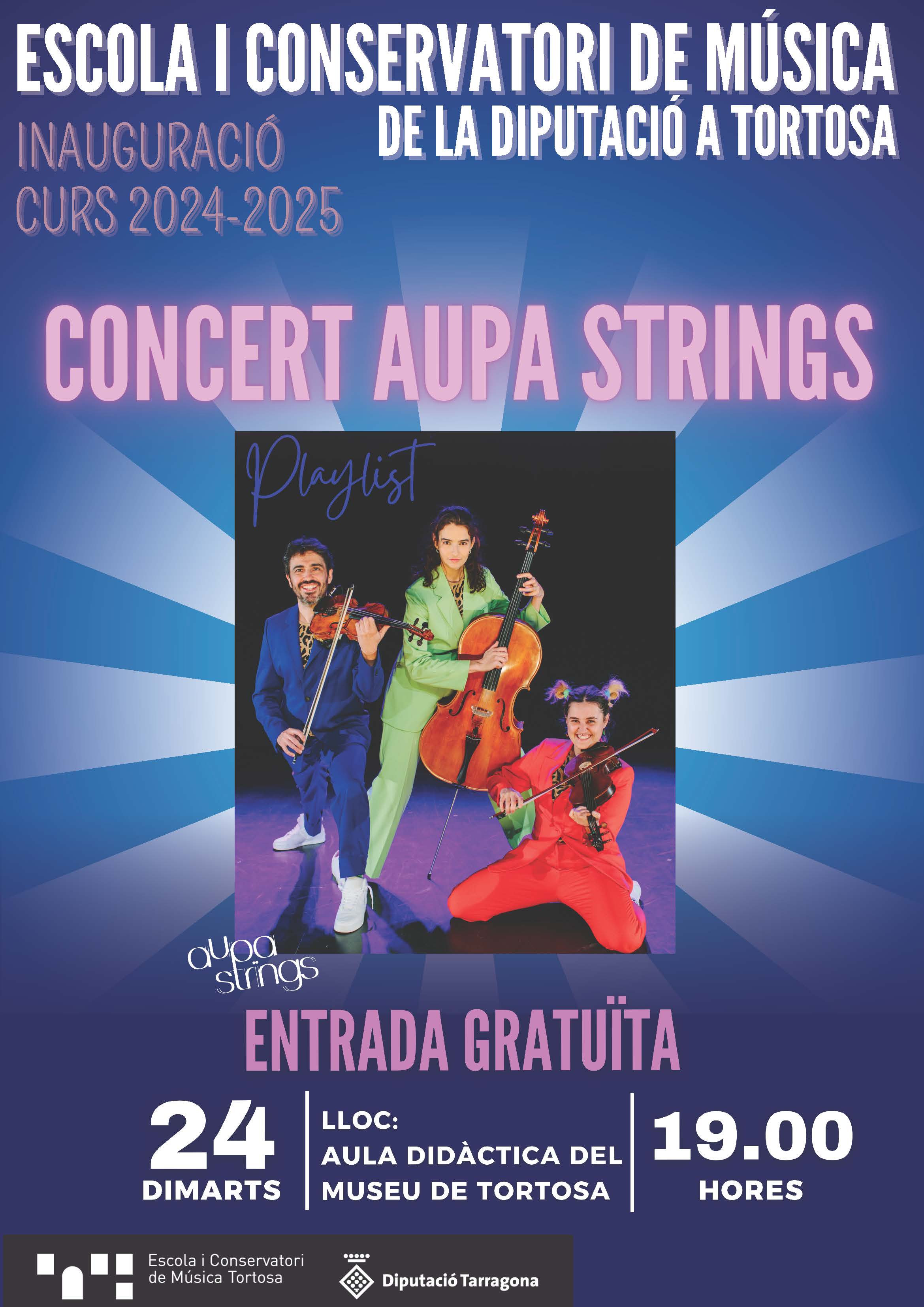 L’espectacle Playlist, a càrrec de "l'Aupa strings", és un concert teatralitzat per públic familiar. Musicalment és una finestra oberta d’estils que relacionen el classicisme i el barroc amb el swing, el rock, el pop, el blues o el bluegrass i pot ser molt enriquidor pel públic en general. Tres músics que comparteixen amistat, cadascú amb el seu estil, es troben per a disfrutar i crear músiques que trapasen les etiquetes.
