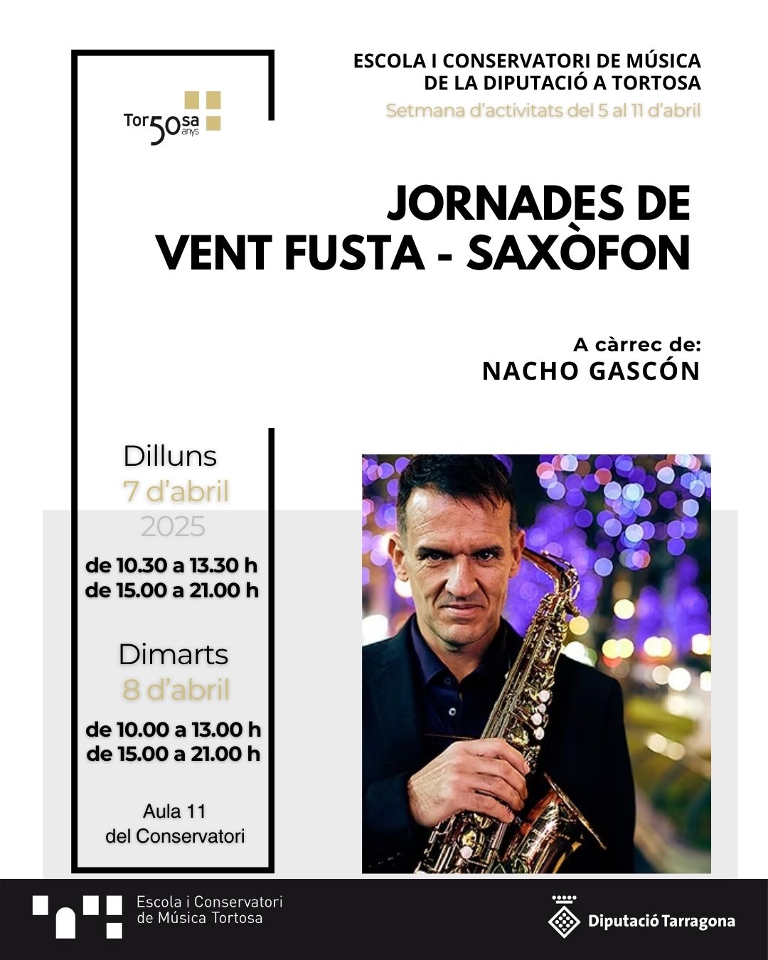 Fil d'ariadna Inici Agenda Jornades de Vent Fusta - Saxòfon Jornades de Vent Fusta - Saxòfon Quan: 7/04/2025 - 8/04/2025 Hora: 10:30 h - 21:00 h On: Aula 11 del conservatori