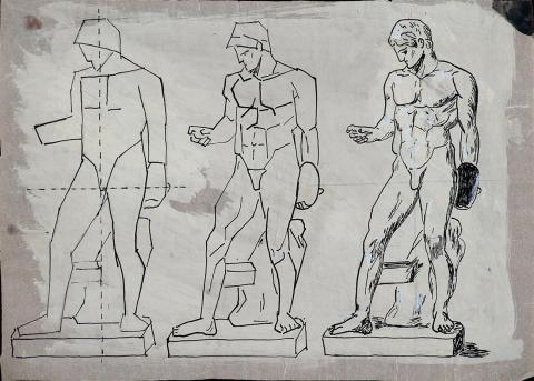 Aiguada sèpia i tinta blava sobre cartró