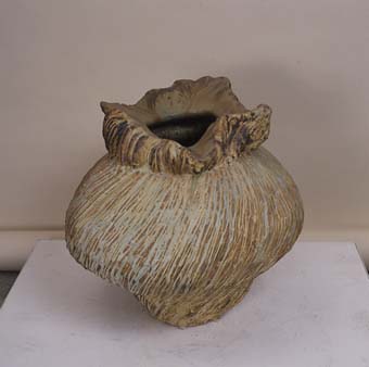 Modelat a mà. Refractari. Texturat exterior. Esmalt jaspiat ocre tan a l'interior com a l'exterior. Diferencies en l'esmalt degut a les textures i tractaments