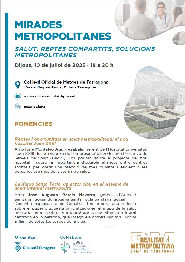 “Salut: reptes compartits, solucions metropolitanes” és la cinquena sessió del cicle “Mirades Metropolitanes” d’aquest any, organitzada per la Diputació de Tarragona. La cita tindrà lloc el proper dijous, 10 de juliol, a les 18h al Col·legi Oficial de Metges de Tarragona (Via de l’Imperi Romà,11 bis, Tarragona). Durant la sessió es reflexionarà sobre reptes i solucions en l’àmbit de la salut.