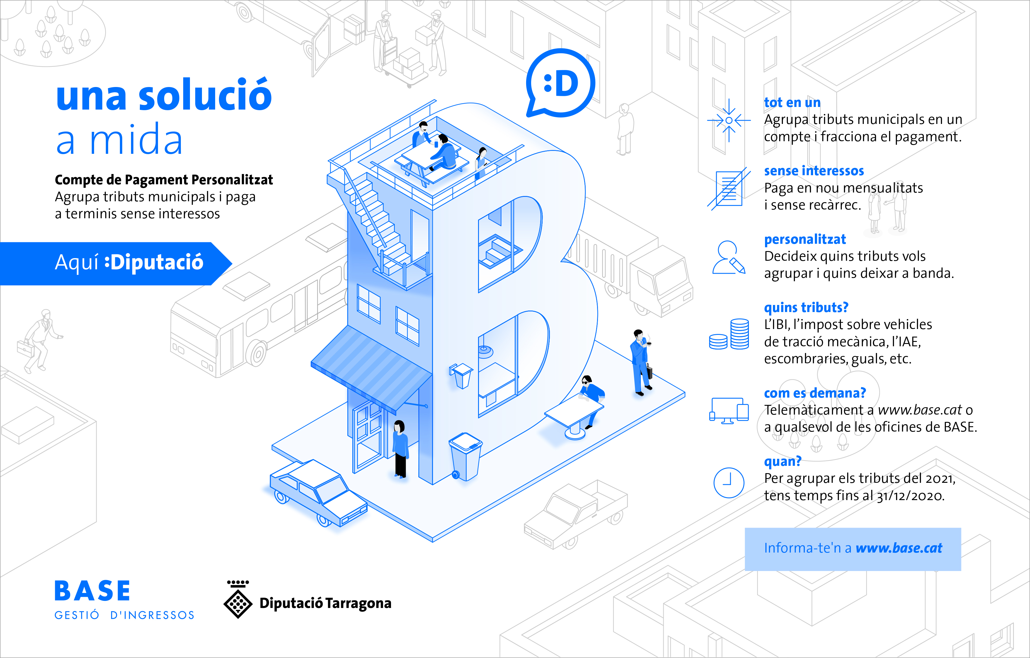 Un any més, BASE-Gestió d'Ingressos, organisme autònom de la Diputació de Tarragona, ofereix als contribuents el Compte de Pagament Personalitzat, una eina que permet agrupar diferents tributs municipals en un compte comú i fragmentar-ne el pagament en nou mensualitats sense interessos. Els ciutadans i empreses interessats de sol·licitar aquest servei de cara a l'any 2021 poden fer-ho fins al 31 de desembre via telemàtica a la web de BASE, www.base.cat, o en qualsevol de les 39 oficines repartides pel territori.