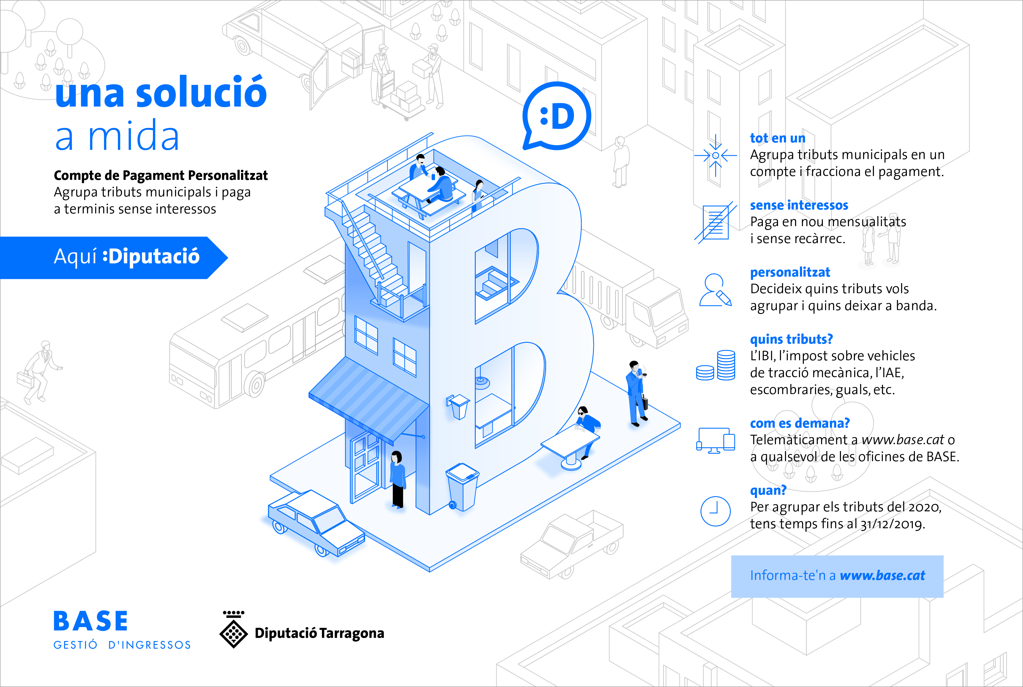 Per tercer any consecutiu, BASE-Gestió d'Ingressos, organisme autònom de la Diputació de Tarragona, ofereix als contribuents el Compte de Pagament Personalitzat, una eina que permet agrupar diferents tributs municipals en un compte comú i fragmentar-ne el pagament en nou mensualitats sense interessos. Els ciutadans i empreses interessats de sol·licitar aquest servei de cara a l'any 2020 poden fer-ho fins al 31 de desembre via telemàtica a la web de BASE, www.base.cat, o en qualsevol de les 39 oficines repartides pel territori.