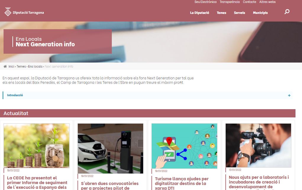 Conscients de la gran oportunitat que pot suposar per al Camp de Tarragona, les Terres de l’Ebre i el Baix Penedès acollir-se a les diferents convocatòries del fons Next Generation, la Diputació de Tarragona ha posat en marxa un nou espai al seu lloc web per tal que els ajuntaments i consells comarcals de la demarcació pugin obtenir informació actualitzada sobre les diferents convocatòries que es vagin obrint. L’espai, que duu per nom “Next Generation info –ens locals”, selecciona, aglutina i unifica tot un seguit d’informació que sovint queda dispersa i que pot ser d’utilitat a l’hora de valorar la idoneïtat d’una iniciativa per a acollir-se a aquest finançament europeu.