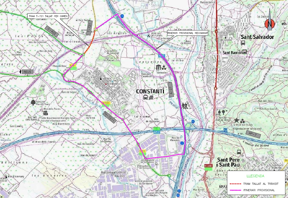 Amb motiu de les obres de l’itinerari de vianants al cementiri de Constantí, la carretera T-721 quedarà tallada dels punts quilomètrics 5,480 a 6,000 els dies 25 i 26 d’agost. S’habilita un itinerari alternatiu provisional.