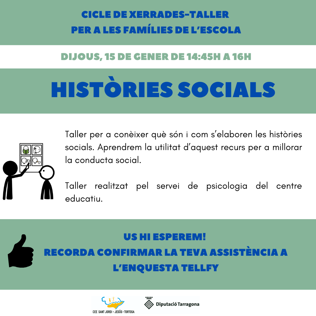 Fil d'ariadna Inici Agenda Taller d'històries socials Taller d'històries socials Taller per a les famílies de l'escola Quan: 15 gener 2026 Hora: 14:45 h - 16:00 h