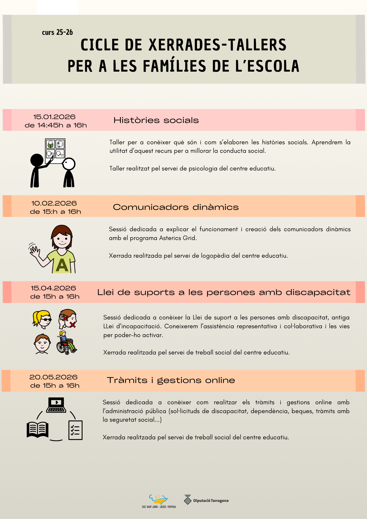 Fil d'ariadna Inici Agenda Xerrades-taller per a les famílies de l'escola Xerrades-taller per a les famílies de l'escola . Quan: 15/01/2026 - 20/05/2026 Hora: 14:45 h - 16:00 h