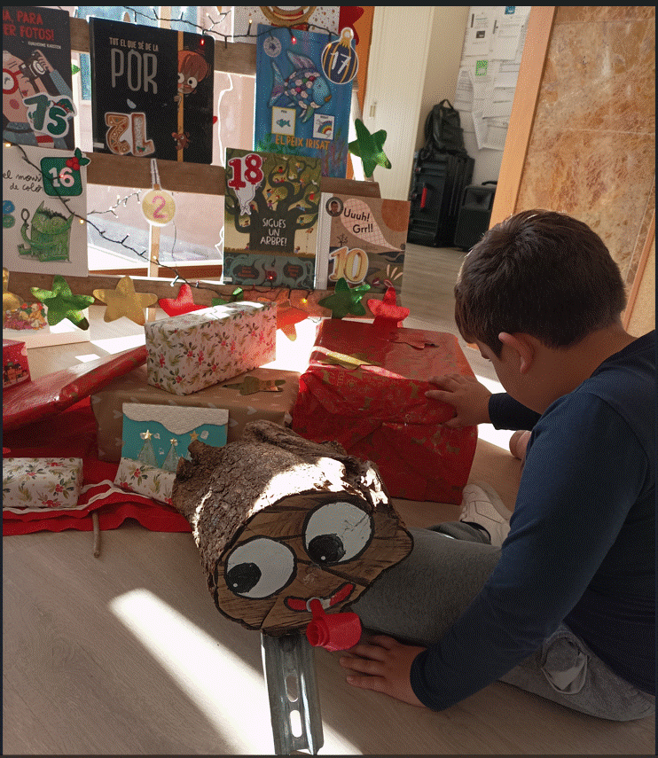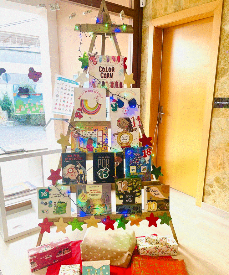 L'escola està ben decorada! Un bonic arbre de Nadal ple de regals i llibres! Al costat el nostre estimat Tió de Nadal, que cada any passa amb nosaltres uns dies i així podem alimentar-lo amb peles de fruites ben saboroses... tot esperant que ens doni molts dolços l'últim dia del trimestre.