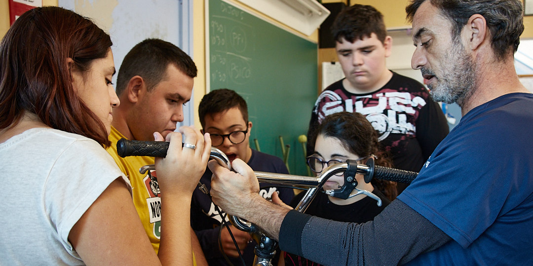 L'equip de Tècniques de Conducció i Control ha preparat un cirucit perquè els alumnes el recorrin amb les bicicletes. D’aquesta manera ensenyen a fer cas als senyals de transit, a les llums dels semàfors, a respectar els pasos de zebra... Els més gran han après a fer el manteniment de les bicis, per tal de poder gaudir-ne de manera segura.