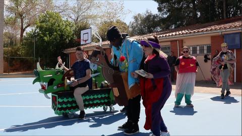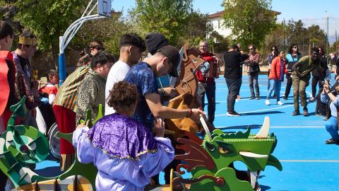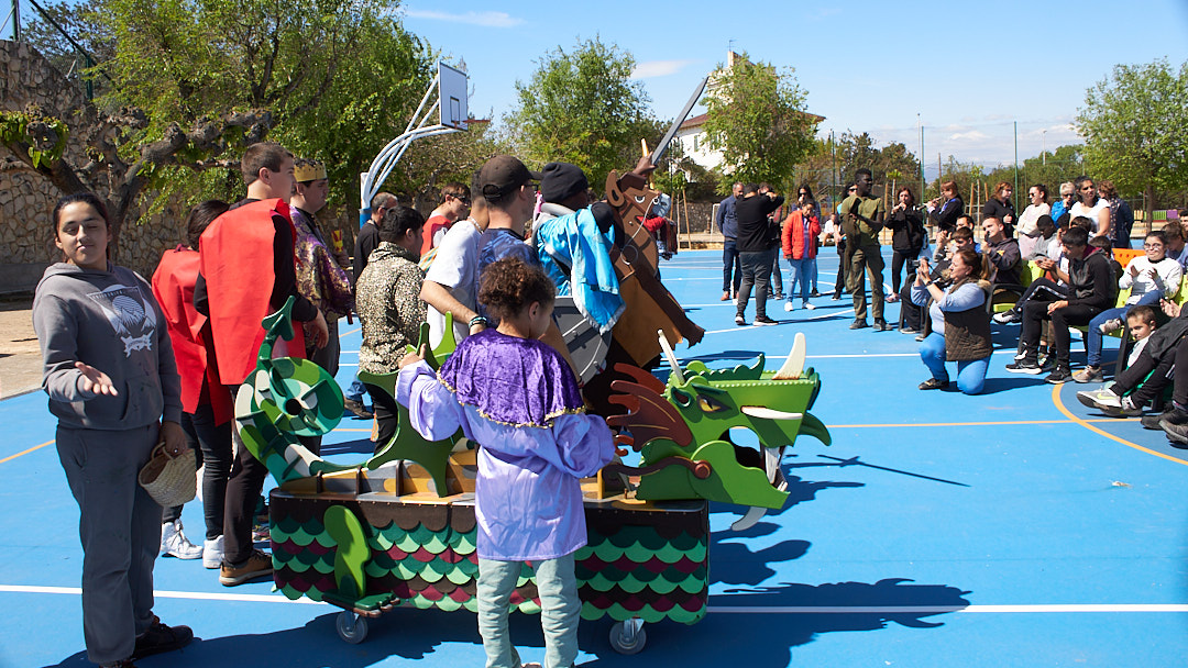 De nou, per Sant Jordi, el dia del llibre i de la rosa, el dia del patró de Catalunya, a l’escola revivim la llegenda. En un lloc tranquil com era la vila de Sant Rafael, la princesa es passeja llegint. Un drac pudent ronda la vila i escampa la por. El rei no sap ben bé què fer. Un bruixot li aconsella de lliurar cada dia una donzella al drac. Fins que li toca a la princesa. La reina es desmaia, al rei li cau el ceptre. Sant Jordi es presenta dalt del seu cavall, s’assabenta del que passa. Per fer sortir el drac de la cova el repta: cuc fastigós -que li diu-. El drac li vol donar una bona lliçó a aquest marrec. Però Sant Jordi li clava l’espasa. De la sang que raja en surt una rosa. Ai las! vet aquí que el drac reviscola! La princesa se n’adona, li fum un cop de llibre al cap i el deixa estès. (Preneu-ne nota: el llibre pot ser una arma contra els dracs dolents.) El cas és que petits i grans fan seva aquesta història. Algunes famílies no s’ho han volgut perdre. Cadascú dirà si li ha agradat; veritat o mentida, aquesta història s’ha acabat.