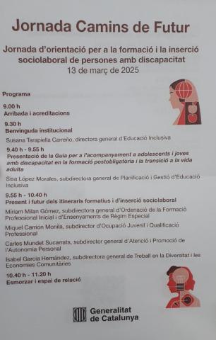 Fil d'ariadna Inici Notícies Participem a unes Jornades del Departament d'Educació Participem a unes Jornades del Departament d'Educació Jornades Camins de Futur sobre la Incersió Sociolaboral Avui participem a la Jornada Camins de Futur per parlar de inserció sociolaboral de persones amb capacitats diverses. Fitxers relacionats